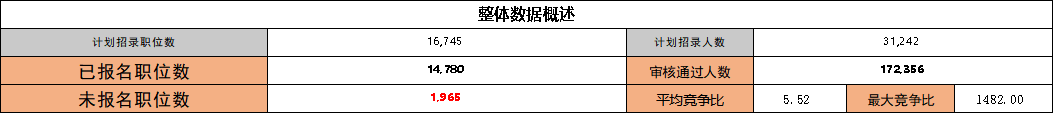 2022年公务员考试报名已进行到第三天。据统计,截止到10月17日17:00,总报名人数已高达266480人,172356人审核,尚有94124人待审核。16745个岗位中,已报名岗位14780个,无人报名岗位1965个,整体岗位报考率达到88.27%。