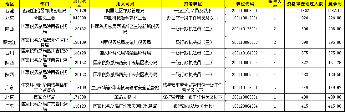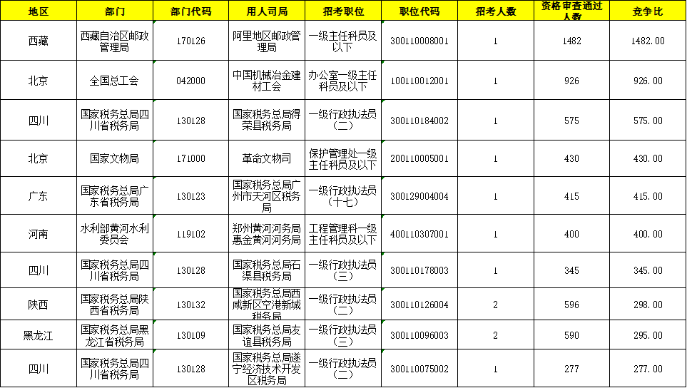 截至17日17:00,资格审查人数较多的岗位发生了改变,名变为“阿里地区邮政管理局一级主任科员及以下”(职位代码:300110008001)。该岗位共招录1人,资格审查人数1482人,这与其较宽松的招考条件有很大关系。