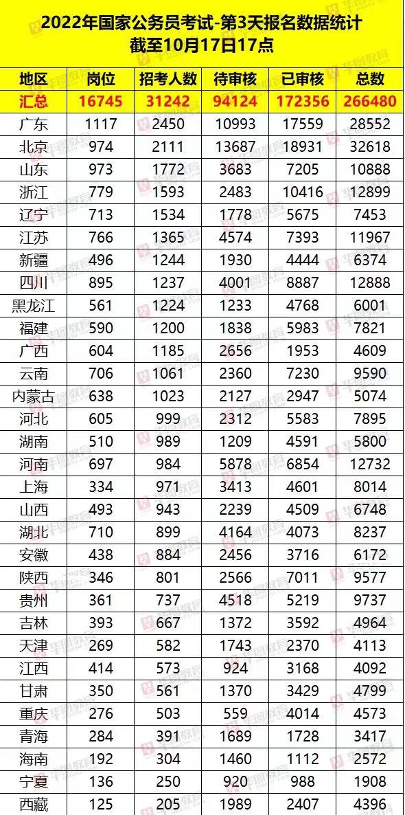 表1. 2022国考报名第三日报考情况(数据截至10月17日17:00)