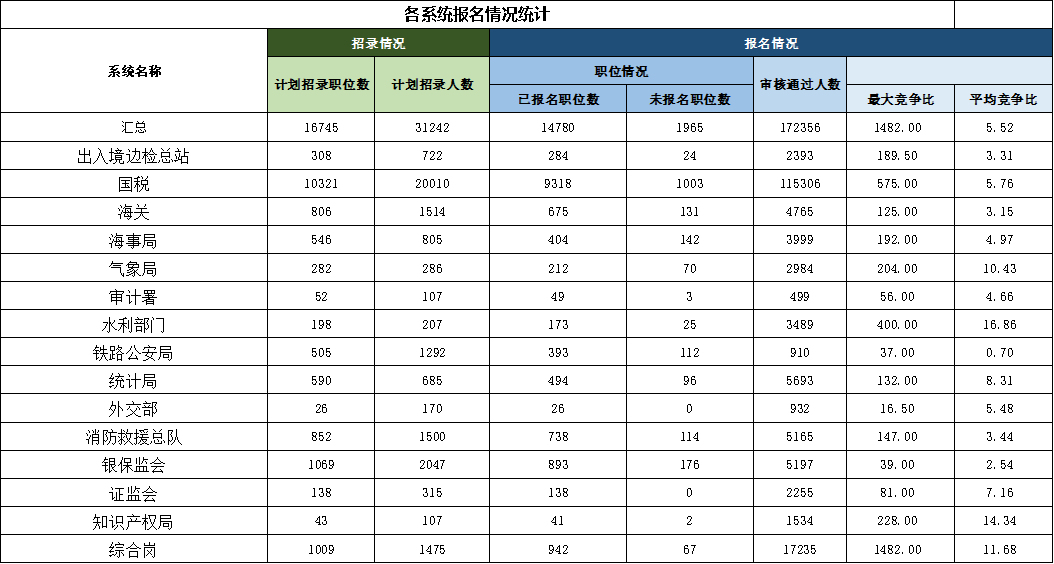 由上表可知,国考报名第三日,国税系统审核人数已达115306人,依旧稳居十五大系统之首;其次为综合岗,报名人数为17235人。但论竞争势头,还是水利部门势头更猛,平均竞争比已达16.86:1。而报考国税系统和综合岗的考生“扎堆”情况依旧比较明显,这一点可从二者的较大竞争比上佐证,国税系统575:1,综合岗1482:1。国考招录十五大系统中,平均竞争比较高的是水利部(16.86:1),其次是知识产权局(14.34:1),较低的是铁路公安局(0.70:1),这与其岗位要求有直接关系。