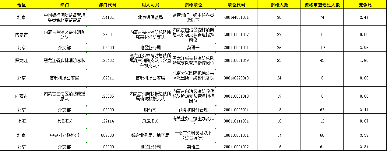 上表为2022国考招录人数较多十大岗位的报考情况,招录人数较多的岗位为“北京银保监局 监管部门一级主任科员及以下”,计划招考30人,截止17日17:00共有74人报名,岗位竞争比为2.47:1。从表中数据可以发现,这些岗位目前的竞争比相对并不高,符合岗位要求的考生可以考虑。